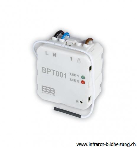 Bei Festanschluss der Infrarotheizung an eine vorhandene Stromleitung oder Verteilerdose kann der UP-Funk-Schalter BPT001 in Verbindung mit dem Funk-Thermostat BPT010 sowie BPT 710 eingesetzt werden. Aber auch bei passender Montage des Empfängers in der Steckdose kann der Empfänger zusätzlich manuell wie ein gewöhnlicher Lichtschalter die Heizung einschalten.